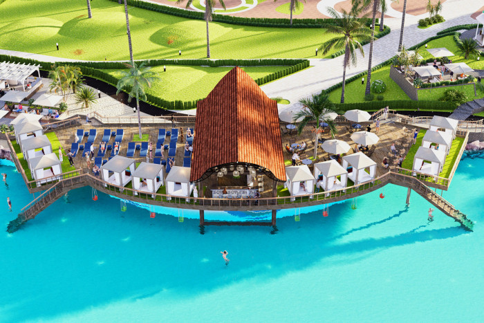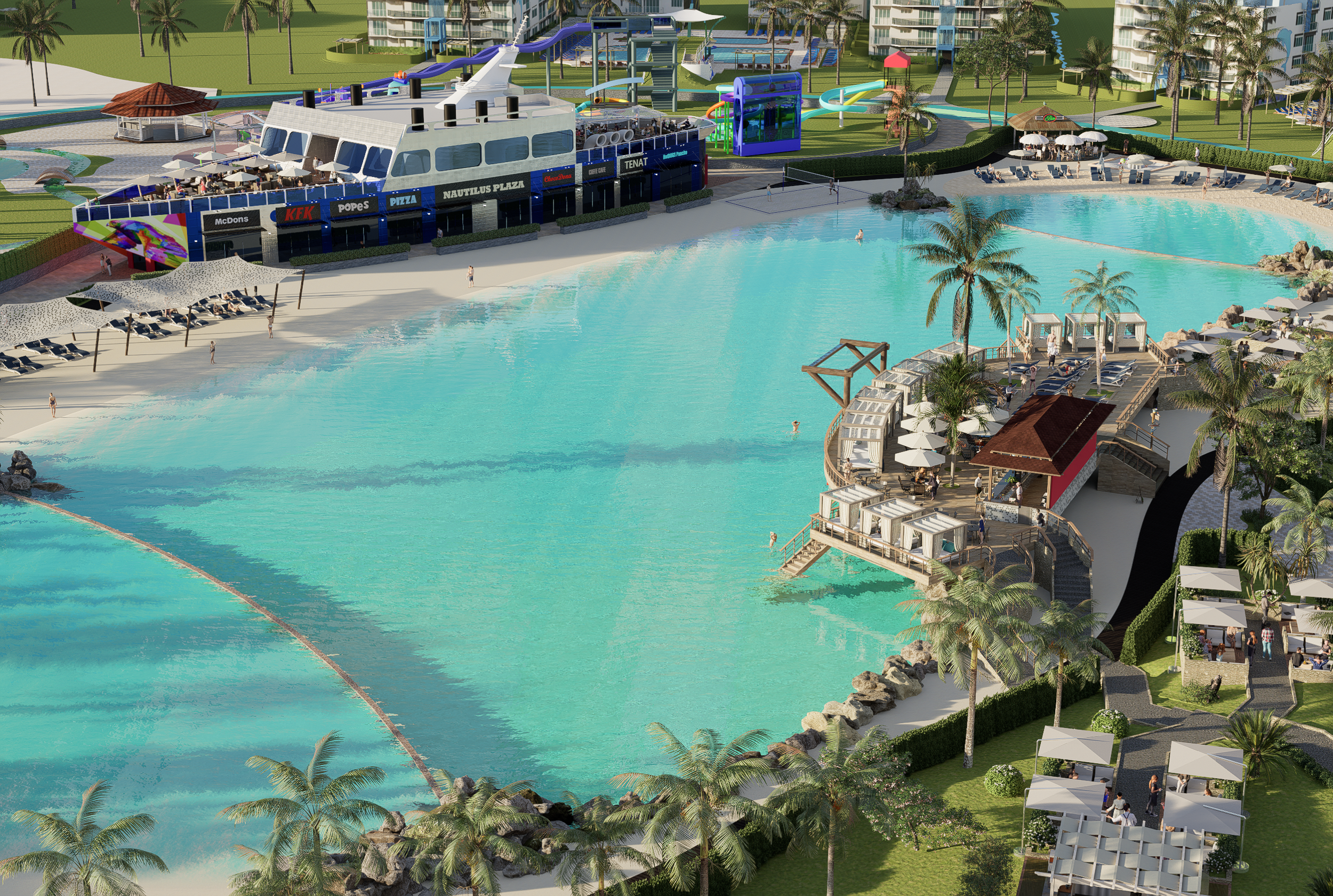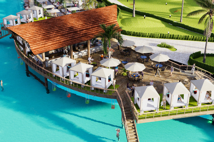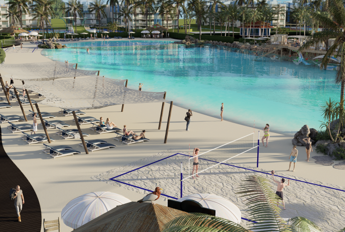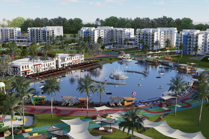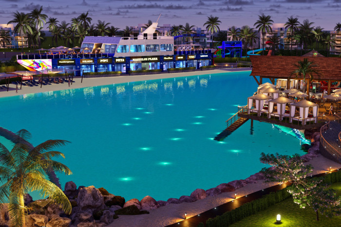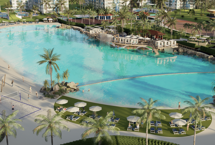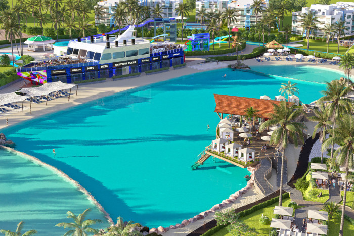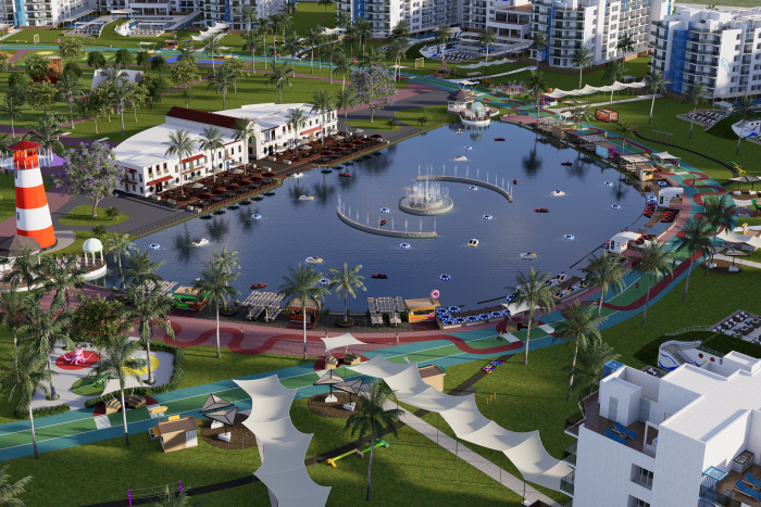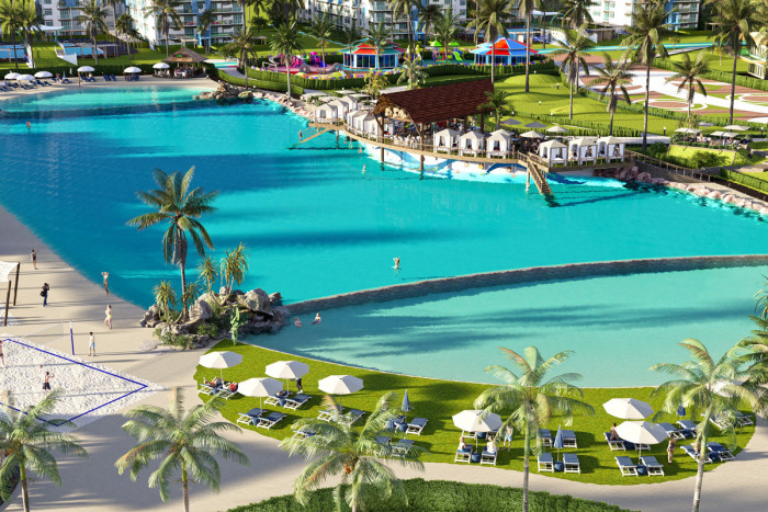 Piscina, Gym, Restaurantes, plaza comercial, cancha de futball, parque, area para montar bicicleta, tenis, volleyball. Tiene 24 majestuosas piscinas centrales repartidas entre los 12 edificios del complejo. Piscina en cada edificio con todas las comodidades; Exclusivas atracciones acuáticas para toda la familia, playa artificial. Ecoparque interactivo con mas de 50,000mt2, complejo deportivo, gran lago interactivo.