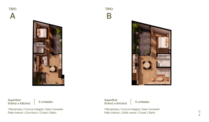 Departamento Tipo A de 61.70m2 con terraza de 18.90. 1 habitación y 1 baño.