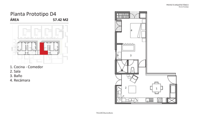 Consta de 57.42m2 con 0.64m2 de exterior en nivel 4. Estancia, comedor, 1 habitación y 1 baño.
