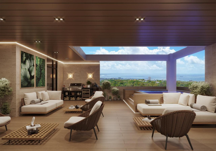 Área social en rooftop con terraza destechada, jacuzzi, área para BBQ y salón multiuso amueblado y climatizado.