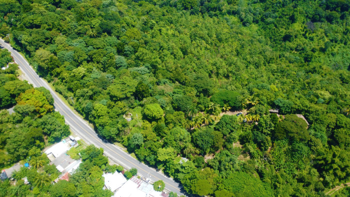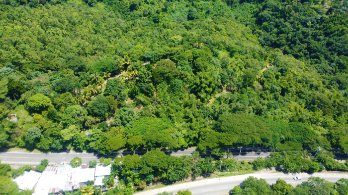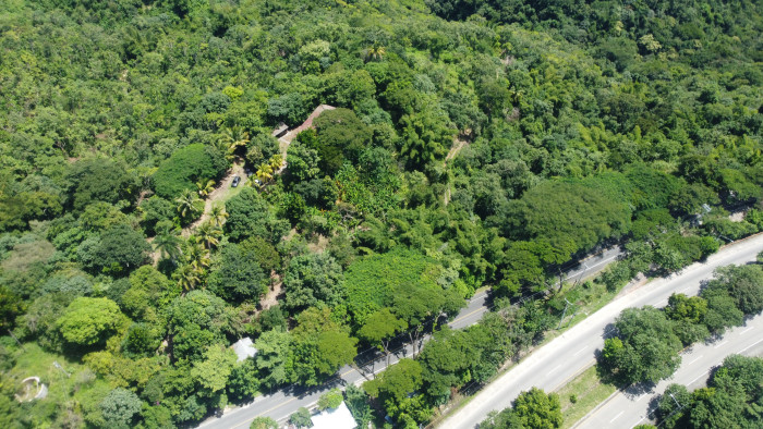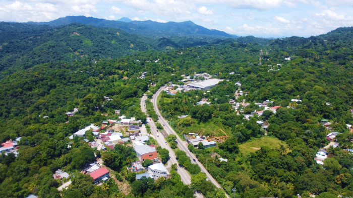 Tiene 388 metros lineales de frente a la carretera, con topografía irregular que incluye áreas planas, inclinadas y descendentes. Cuenta con árboles maderables como cortez, caoba del pacífico y cultivo de cacao. Además, dispone de dos tanques de agua para riego por gravedad.