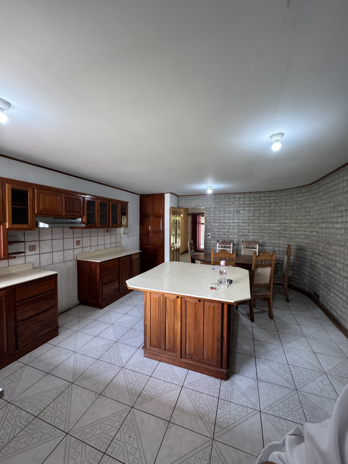 Cocina independiente muy amplia con sobres de madera y comedor.