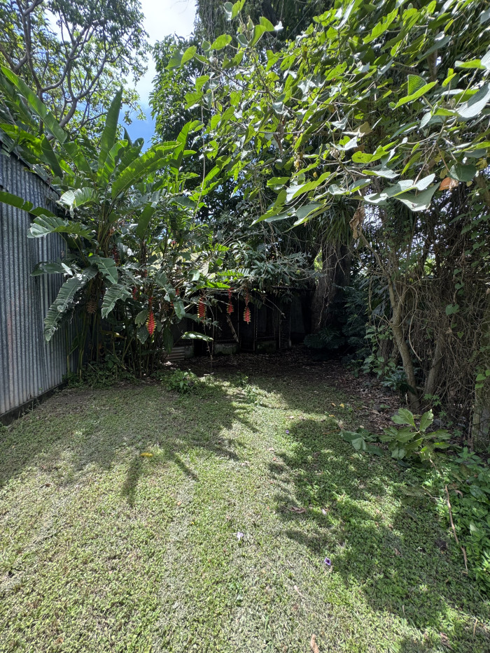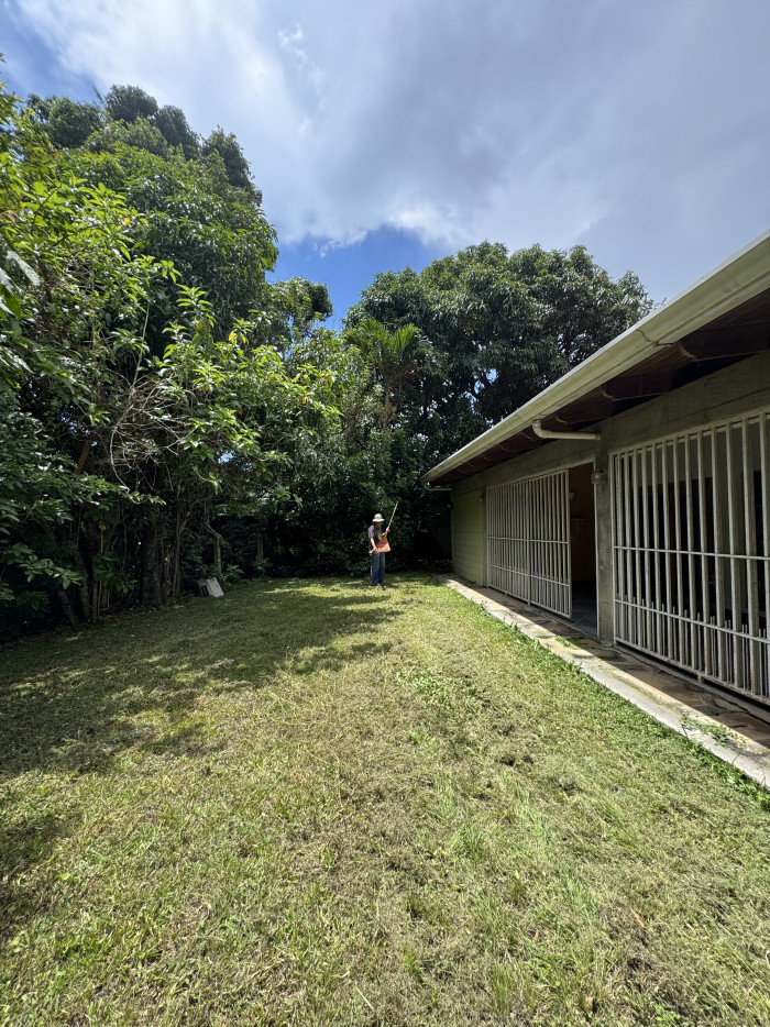 Jardín enorme con áreas verdes y árboles maduros.