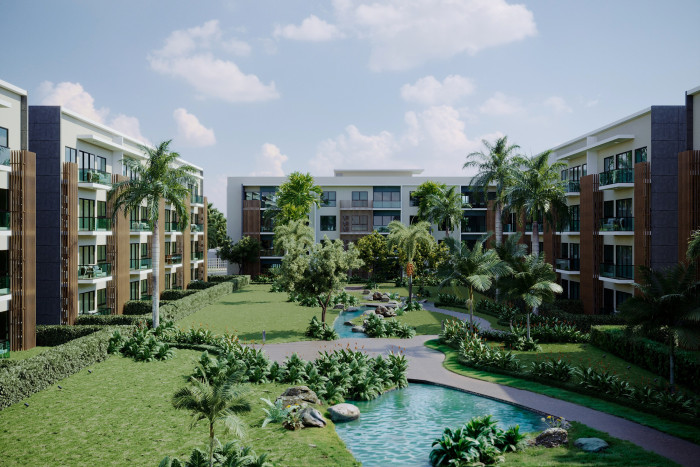 Apartamentos de 2 habitaciones con vistas impresionantes al Summer Gardens, un oasis con río artificial y más de 20,000 m² de áreas verdes privadas.