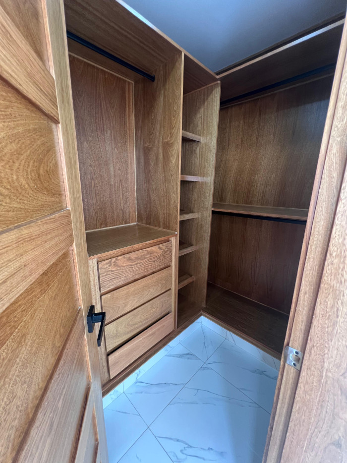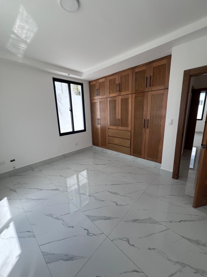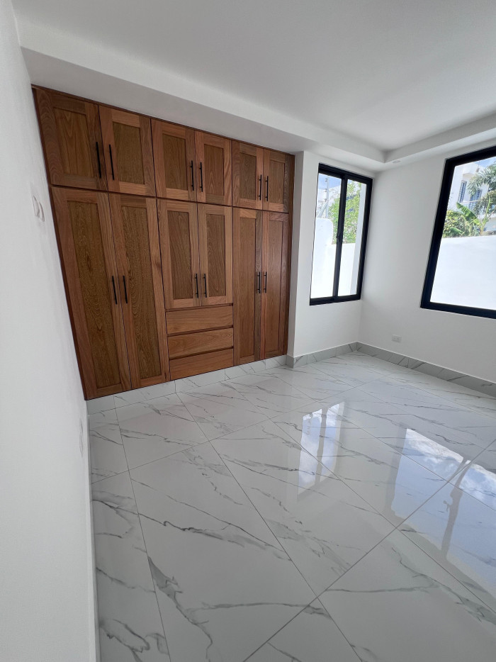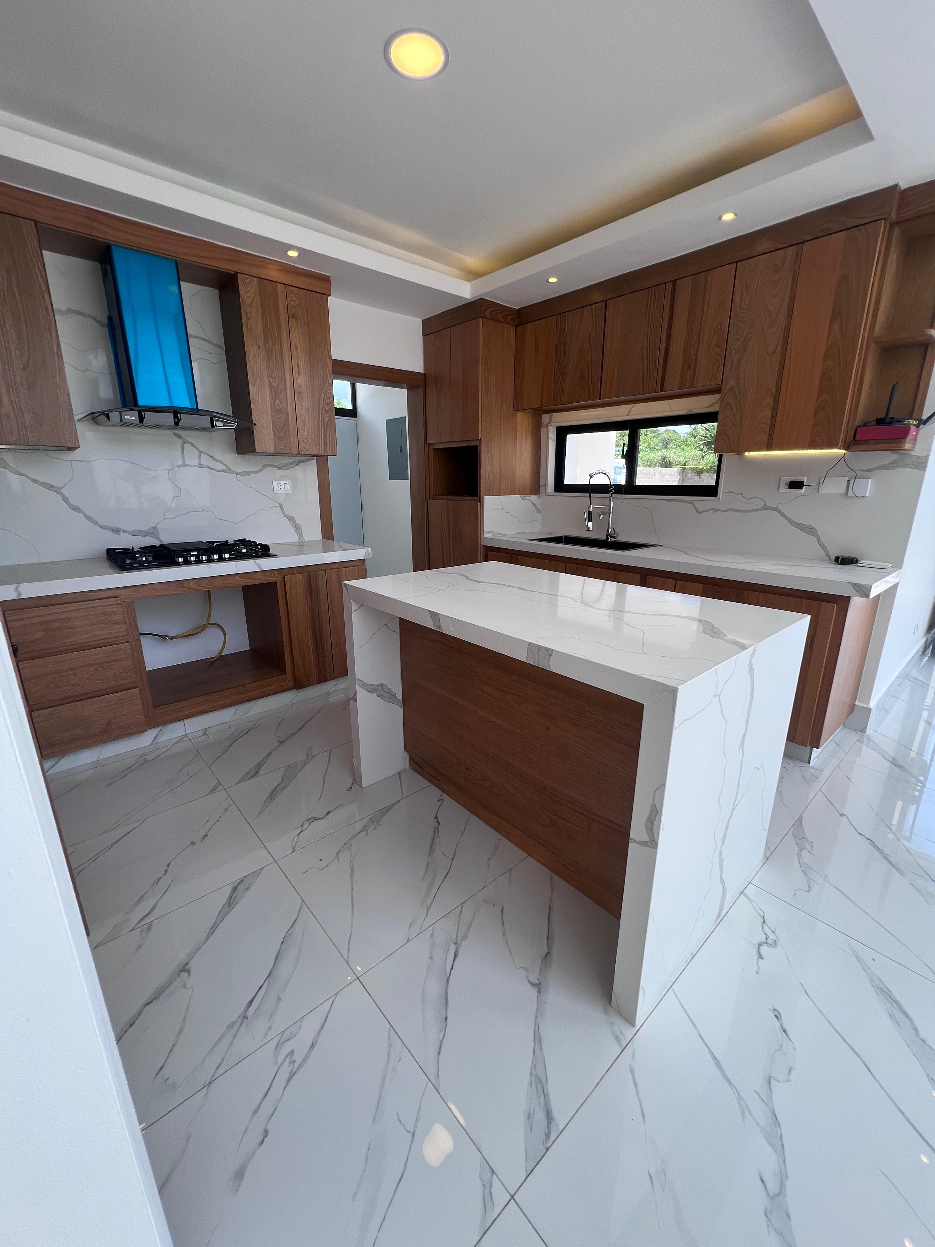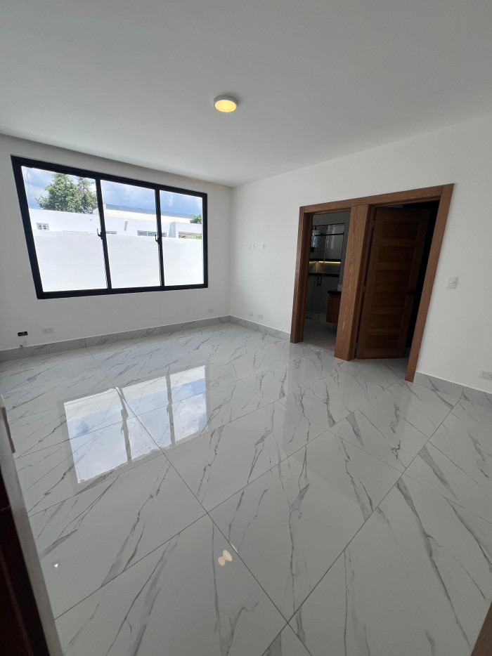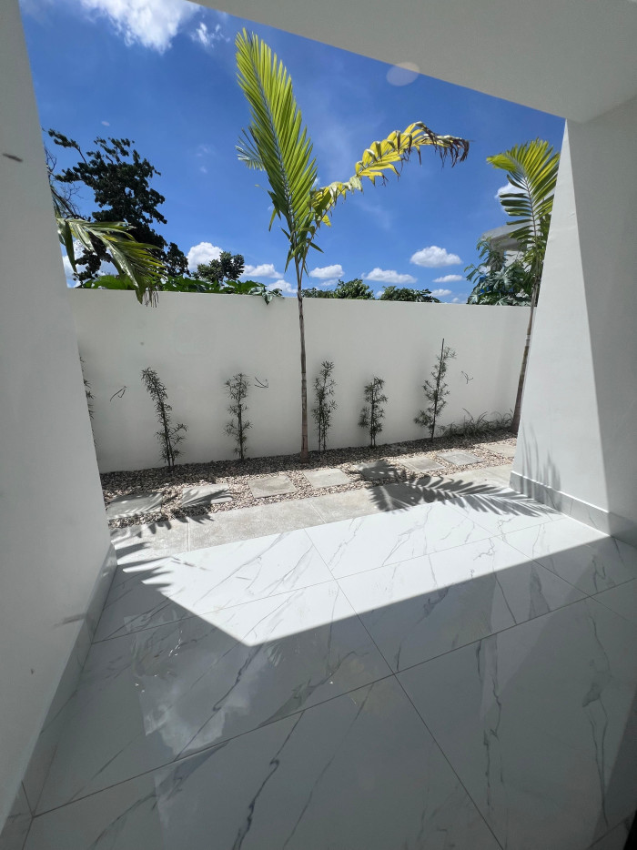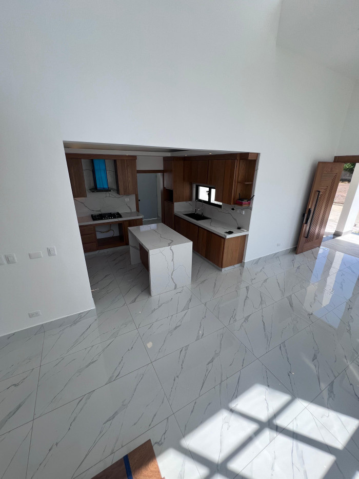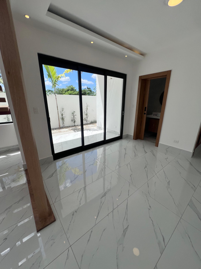 marquesina con capacidad para cuatro vehículos, amplia sala, comedor, cocina moderna con línea blanca incluida, área de lavado, baño común, terraza con acceso al patio, tres habitaciones, dos baños completos, un walk-in closet y dos closets estándar.