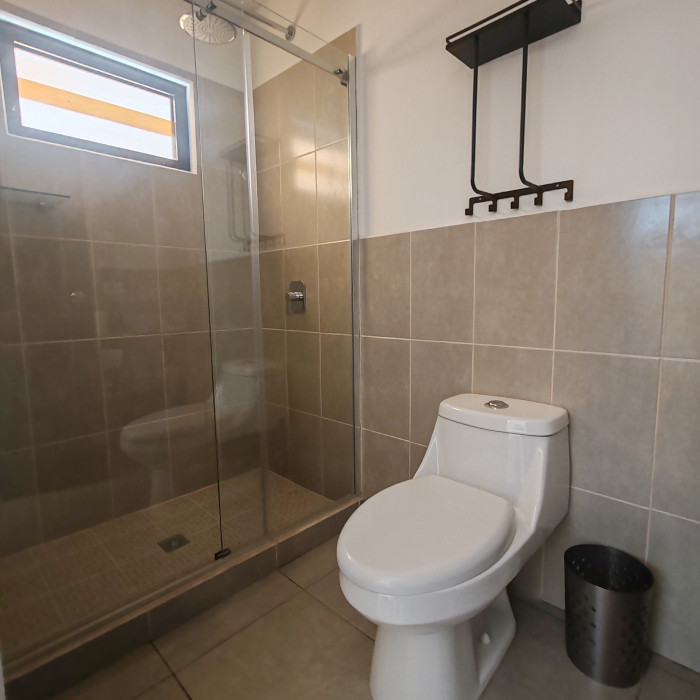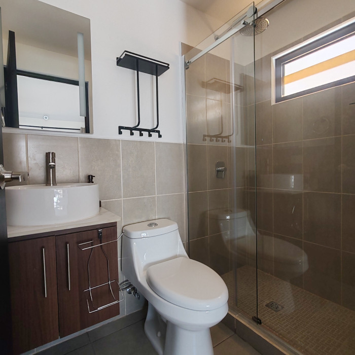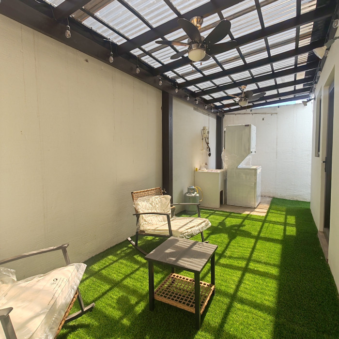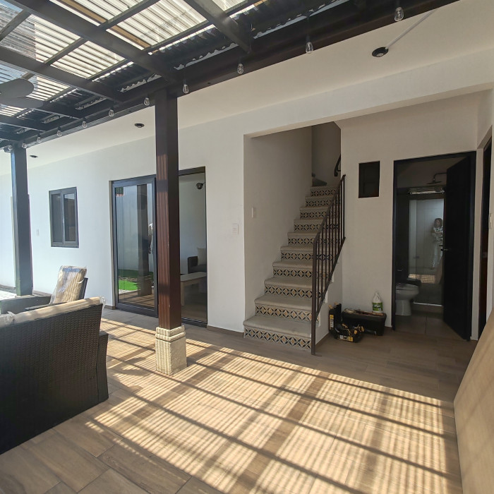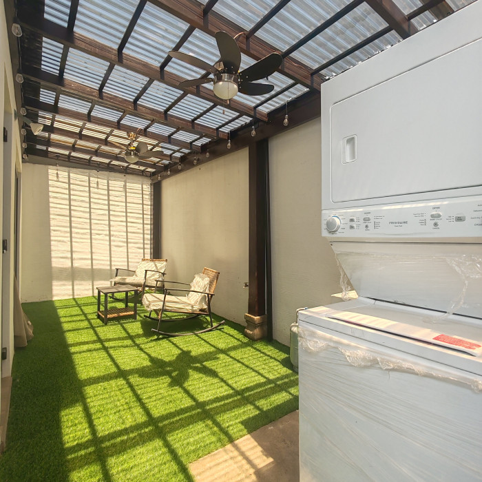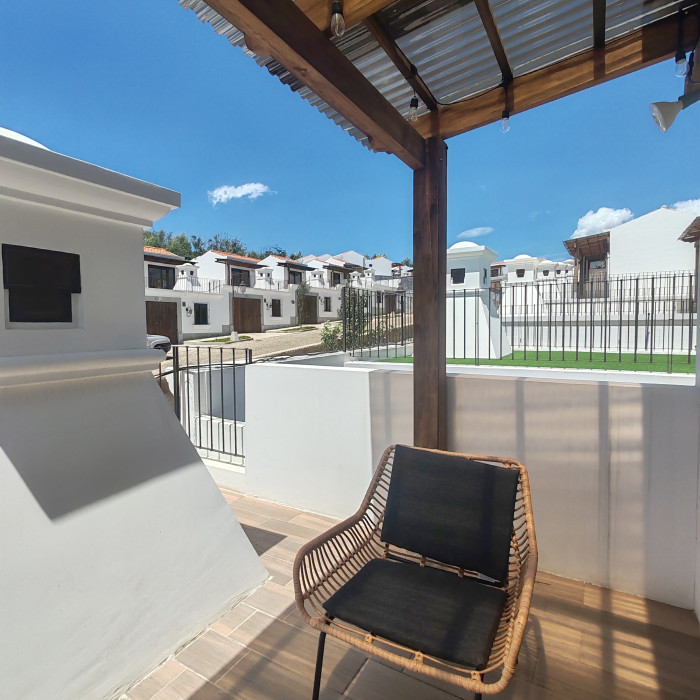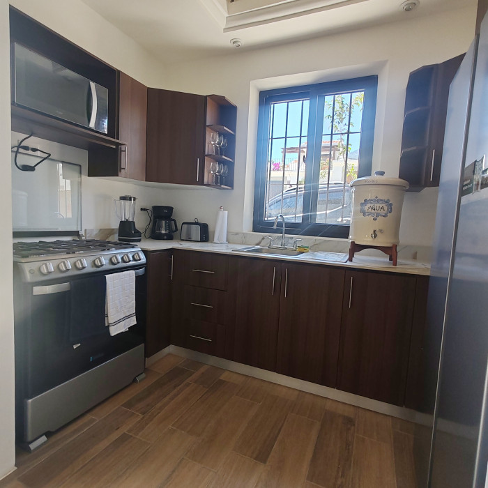 La cocina es de melamina con top de cuarzo estelar y una linternilla que aporta luz al espacio. Las puertas son de MDF, y la ventanería está fabricada en aluminio, el portón principal es de madera lo cual brinda un toque tradicional y robusto en la entrada.