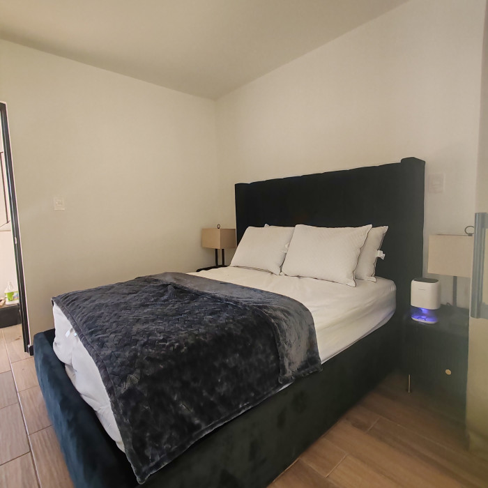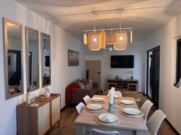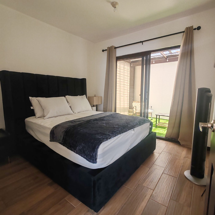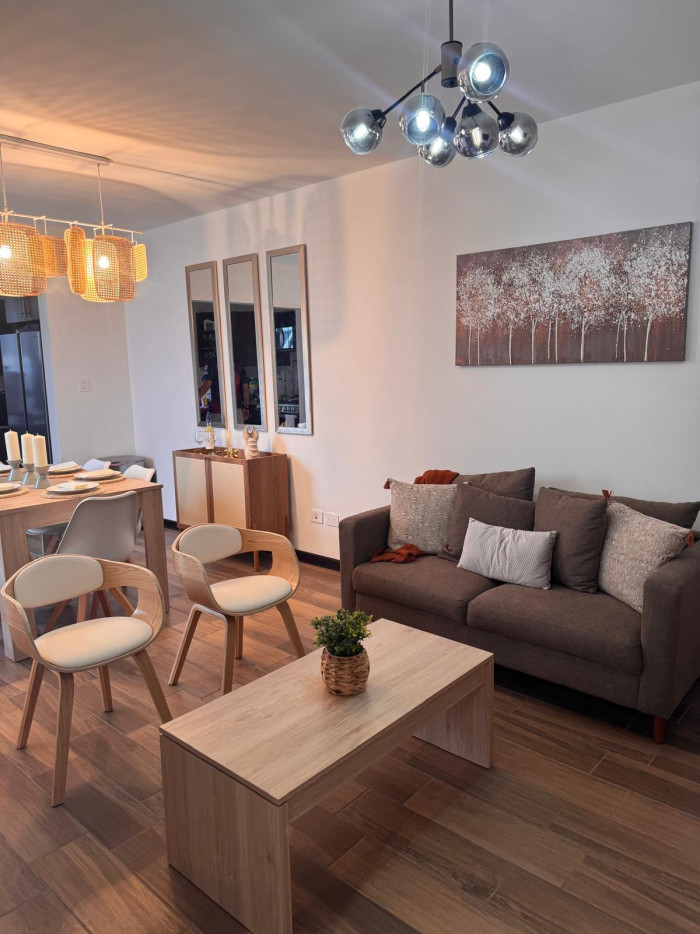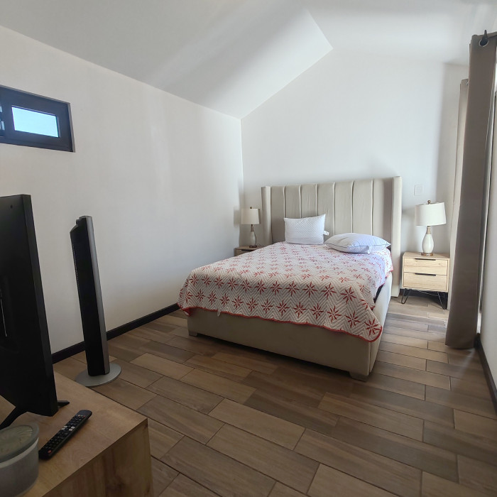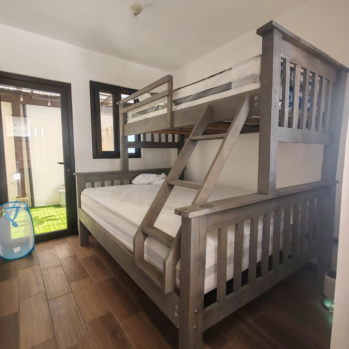 La cocina es de melamina con top de cuarzo estelar y una linternilla que aporta luz al espacio. Las puertas son de MDF, y la ventanería está fabricada en aluminio, el portón principal es de madera lo cual brinda un toque tradicional y robusto en la entrada.
