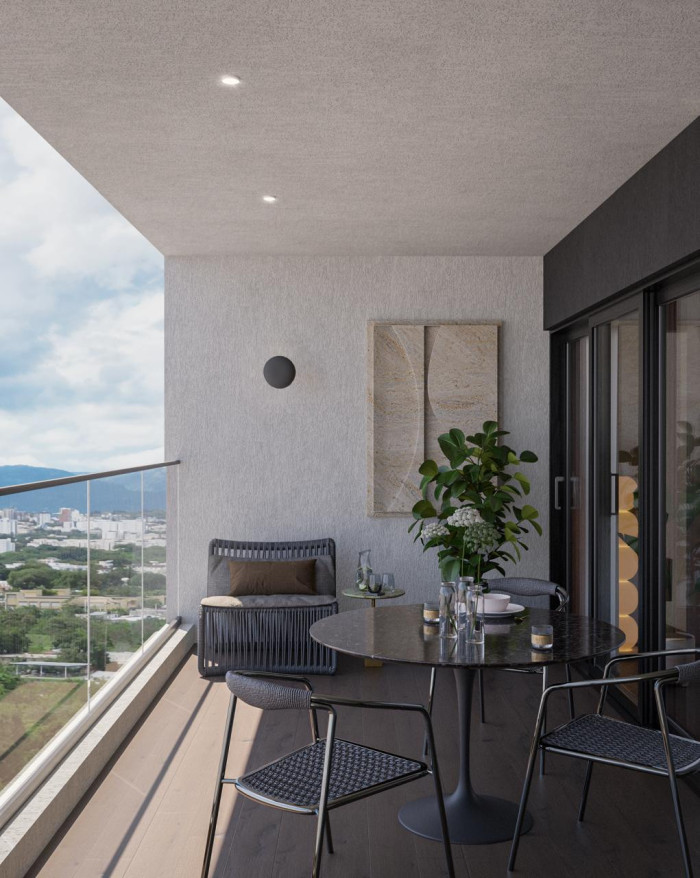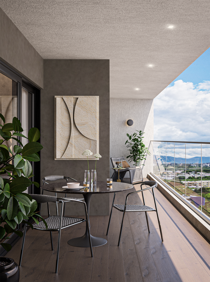 Hemos diseñado un residencial donde la creatividad es la gran protagonista de sus exteriores. Cada elemento que compone la fachada del edificio se integra en perfecta armonía con las terrazas, logrando una estética moderna, sostenible y original que realza el carácter distintivo de toda la urbanización.