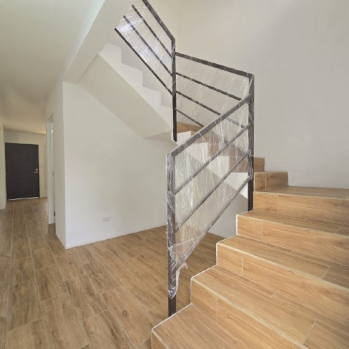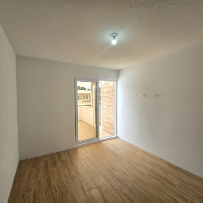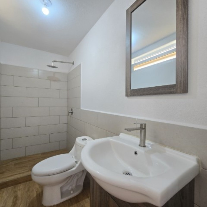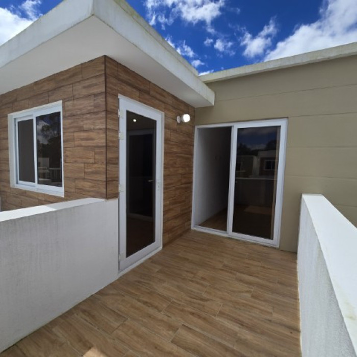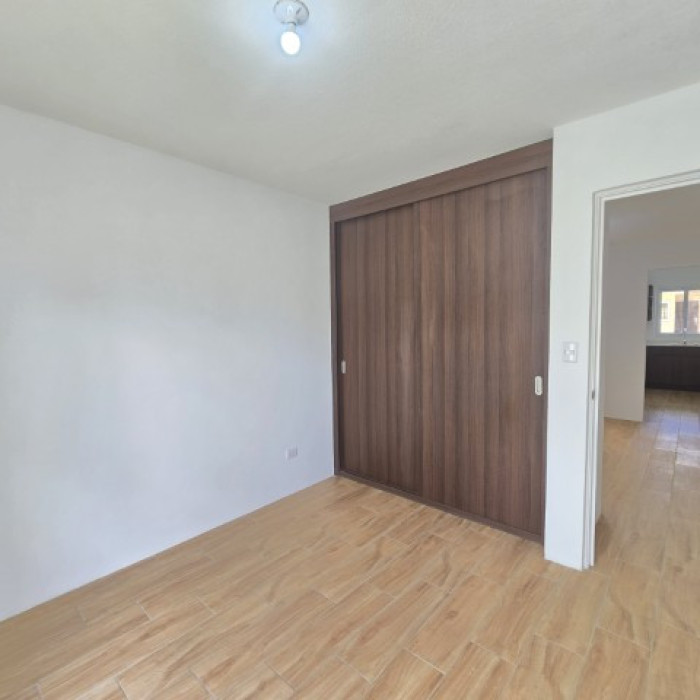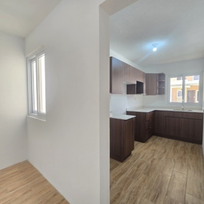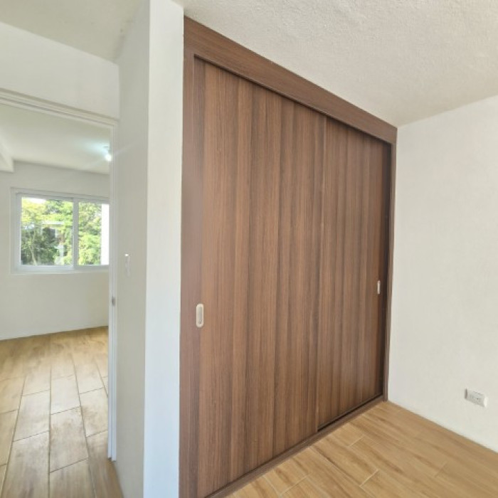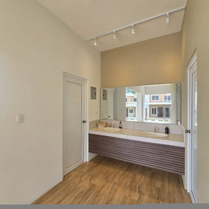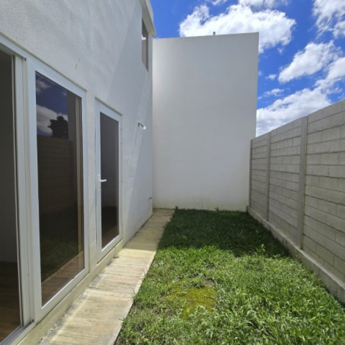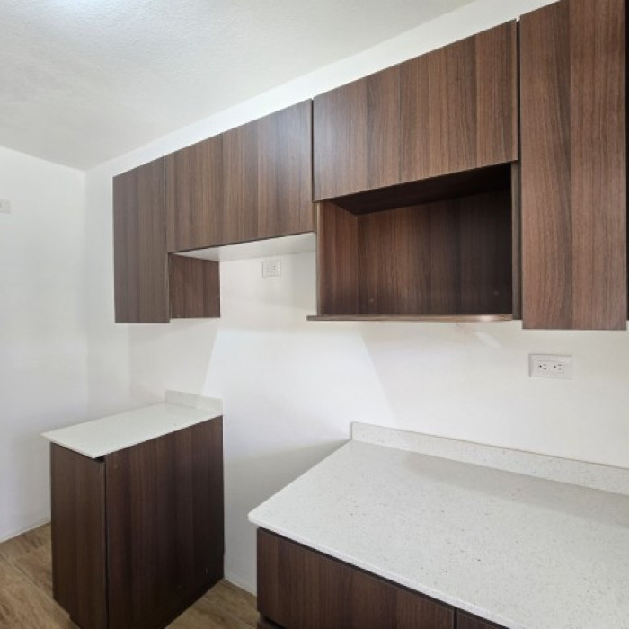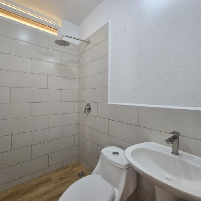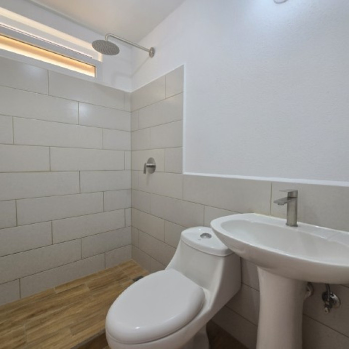 Gabinetes en la cocina, closets grandes y baño privado para cada habitación, una de las habitaciones está en el primer nivel, el balcón es grande y compartido para dos habitaciones. Pasillo lateral hacia el jardín posterior y lavandería. Ambientes iluminados y ventilados naturalmente.
