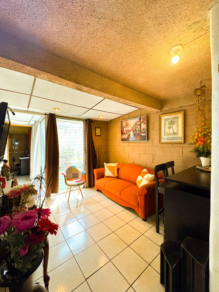 La primera planta ofrece una amplia cochera techada para dos vehículos, sala principal, comedor, cocina, baño social con ducha, habitación de servicio con baño y otra habitación con baño privado, ideal para una persona mayor o para utilizarse como estudio. Además, cuenta con una segunda sala, un acogedor jardín y cisterna.