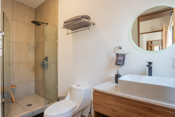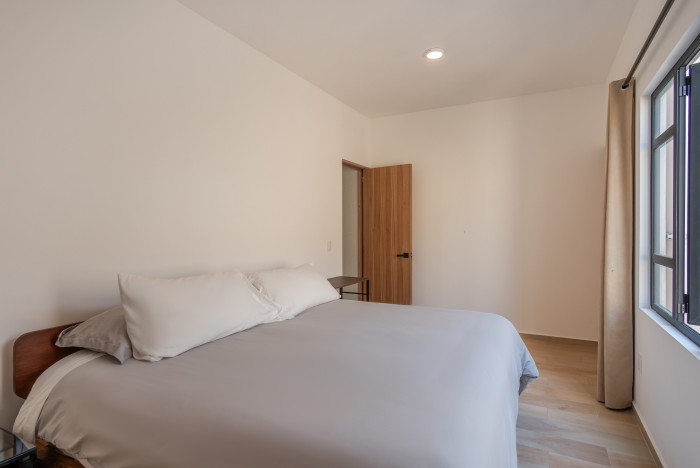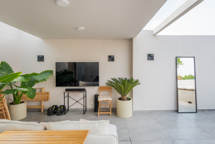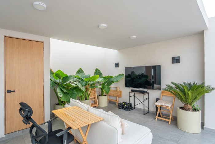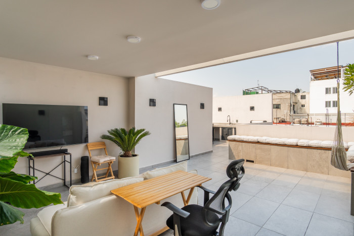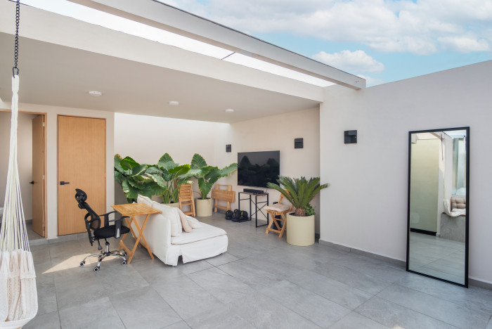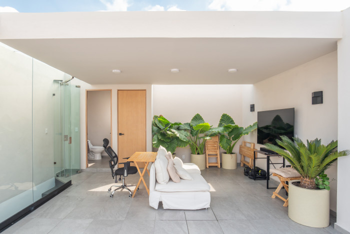 En el primer nivel cuenta con 55 m² distribuidos en una amplia estancia con cocina abierta, 1 recámara con walk-in clóset y baño completo. En el segundo nivel encontrarás una terraza privada de 56 m² con pérgola, medio baño y espacio ideal para disfrutar al aire libre o recibir visitas.