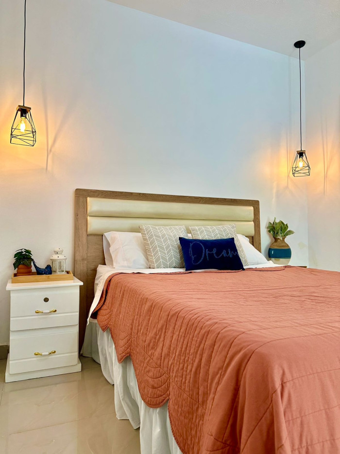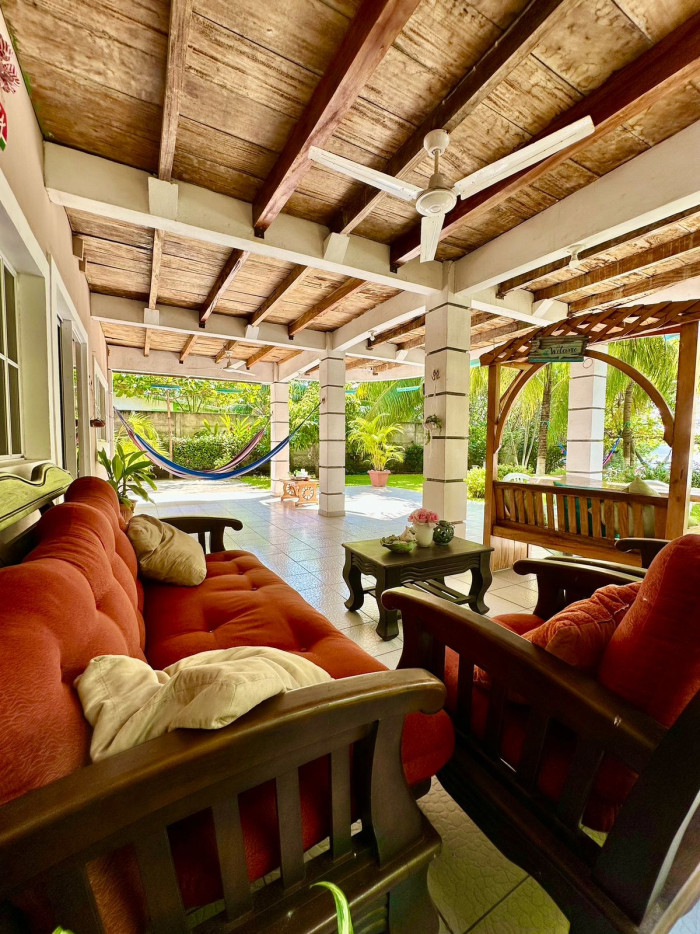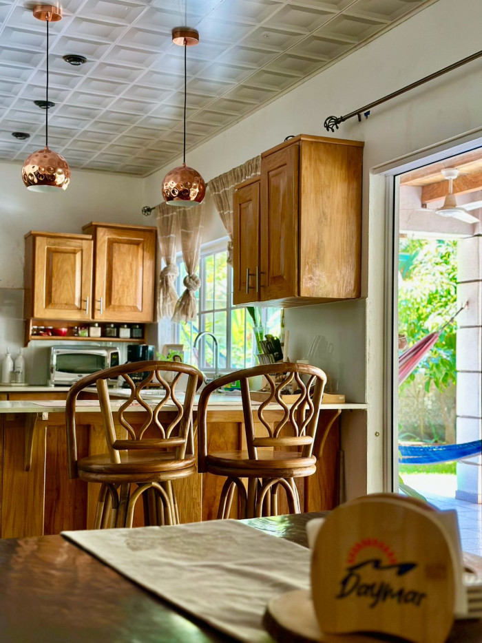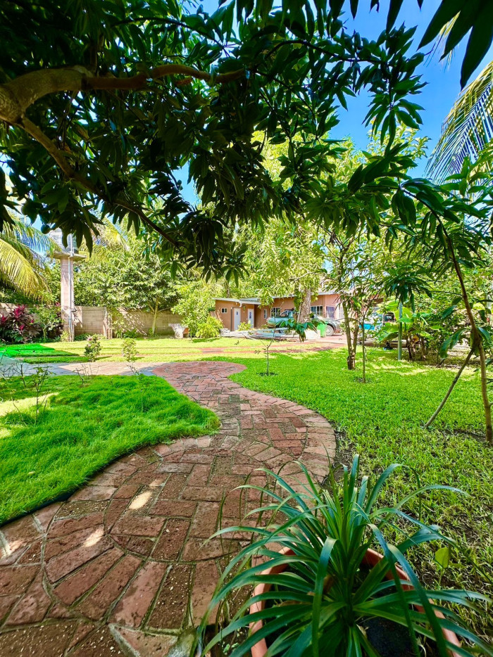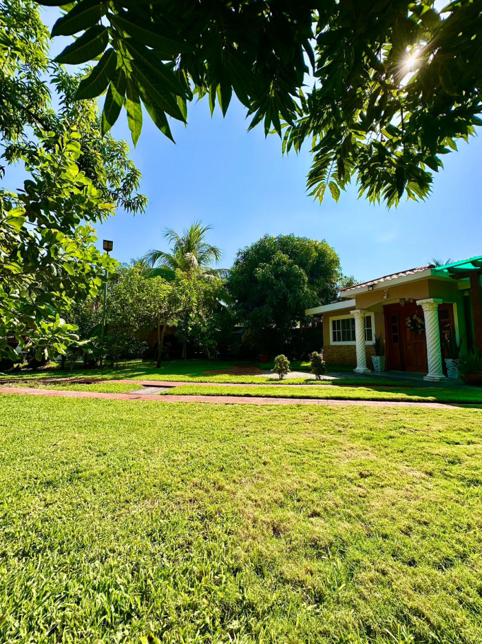 El terreno tiene 1,230 m² y la casa principal 350 m² de construcción, distribuidos en tres habitaciones, dos con aire acondicionado; dos baños completos, sala familiar, comedor, cocina equipada con enfriador de aire, horno y área de lavado; toda la construcción tiene menos de cinco años de antigüedad.