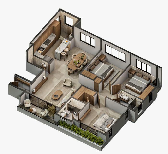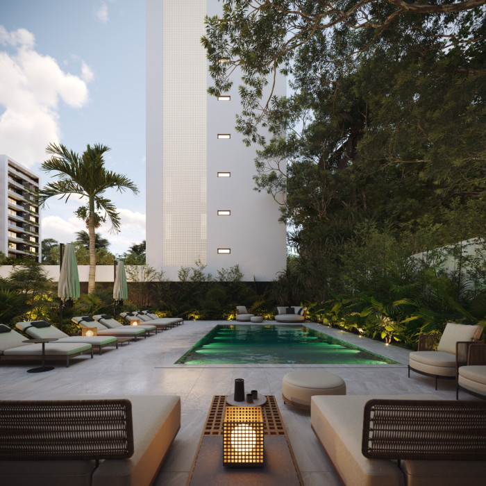 Las torres están elegantemente unificadas por más de 2,500 m² de áreas verdes y sociales, con dos parques centrales que actúan como un pulmón natural dentro del proyecto, ideal para disfrutar un entorno relajado, familiar y sofisticado.