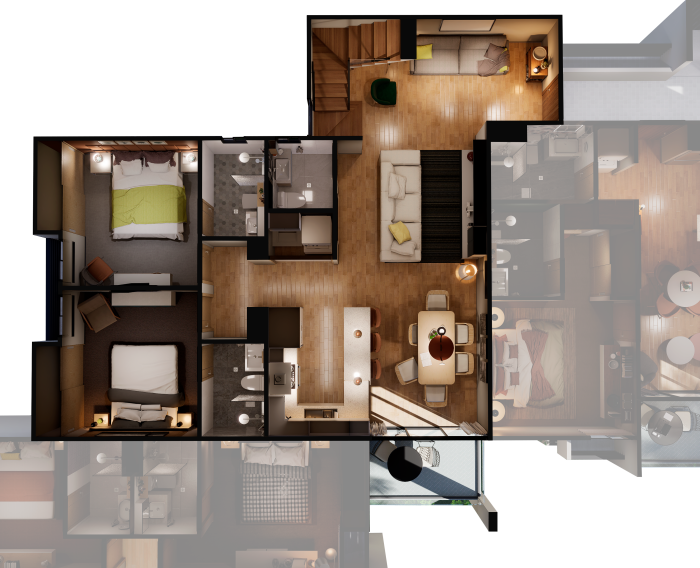 Distribuidos en módulos de dos (2) niveles con un diseño modernista que permite albergar áreas recreativas de uso común en el centro.