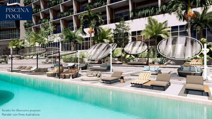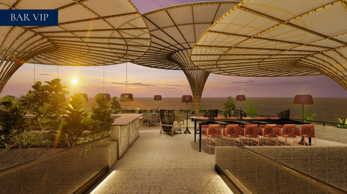 El desarrollo cuenta con amenidades tipo resort, entre ellas piscinas, bar, áreas sociales, parque acuático, zonas VIP y rooftops con vistas panorámicas, diseñadas para ofrecer comodidad, descanso y entretenimiento en un ambiente de alto nivel.