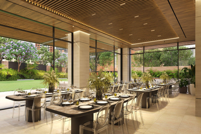 – Lobby y drop-off – Área de co-working – Gimnasio interior y exterior – Infinity pool y jacuzzi – Firepit – Yoga deck – Churrasquera – Pet area – Salón de eventos – Área de paquetería – Bar/Lounge