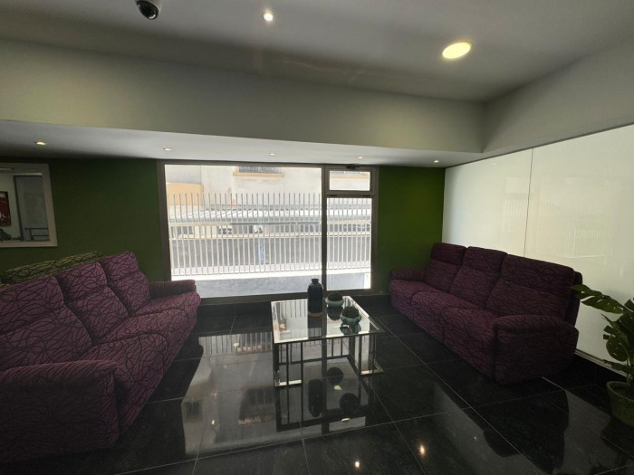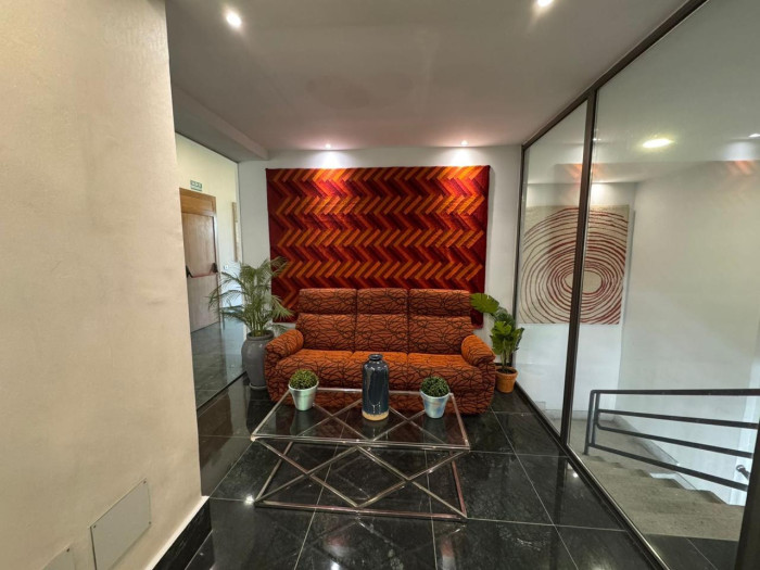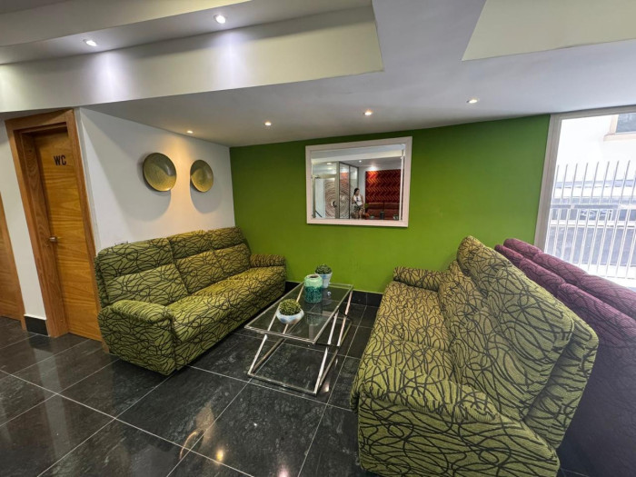 Lobby amplio, moderno y climatizado, con áreas de estar y espera.
