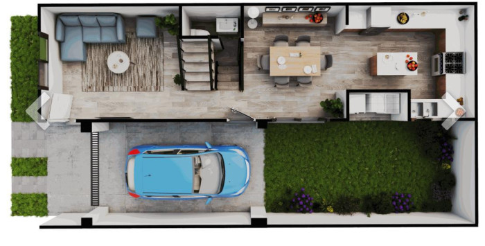 Sala principal, baño de visitas, comedor, amplia cocina, garage para 2 vehículos, lavandería, jardin con terreno extra