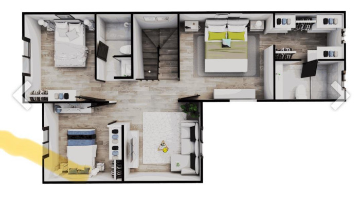 3 habitaciones, principal con walking closet y baño, 2 secundarios comparten baños, habitaciones con closets, sala familiar