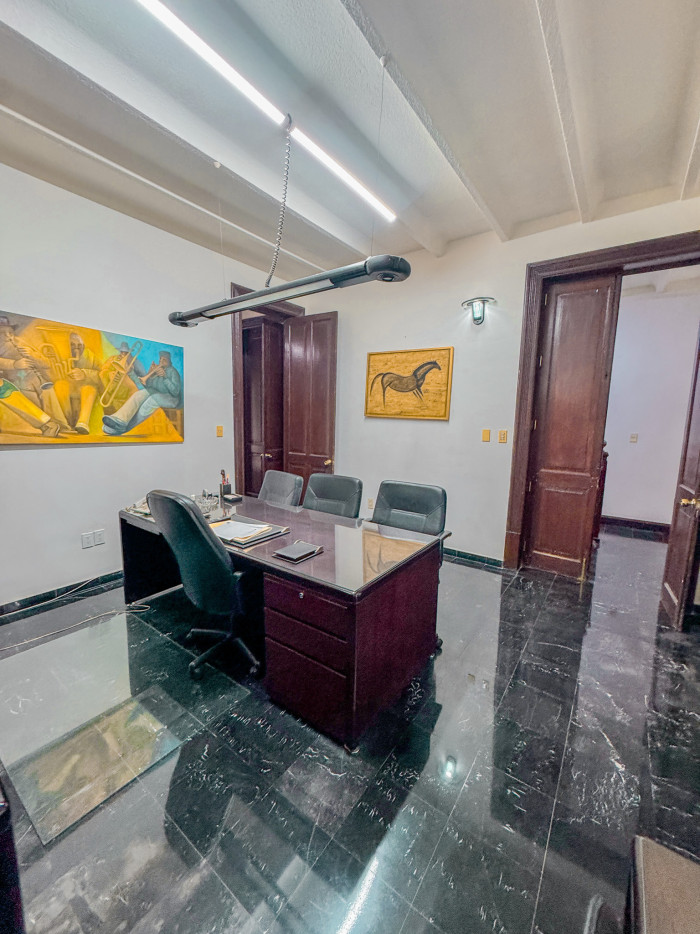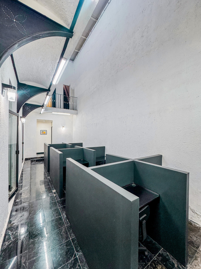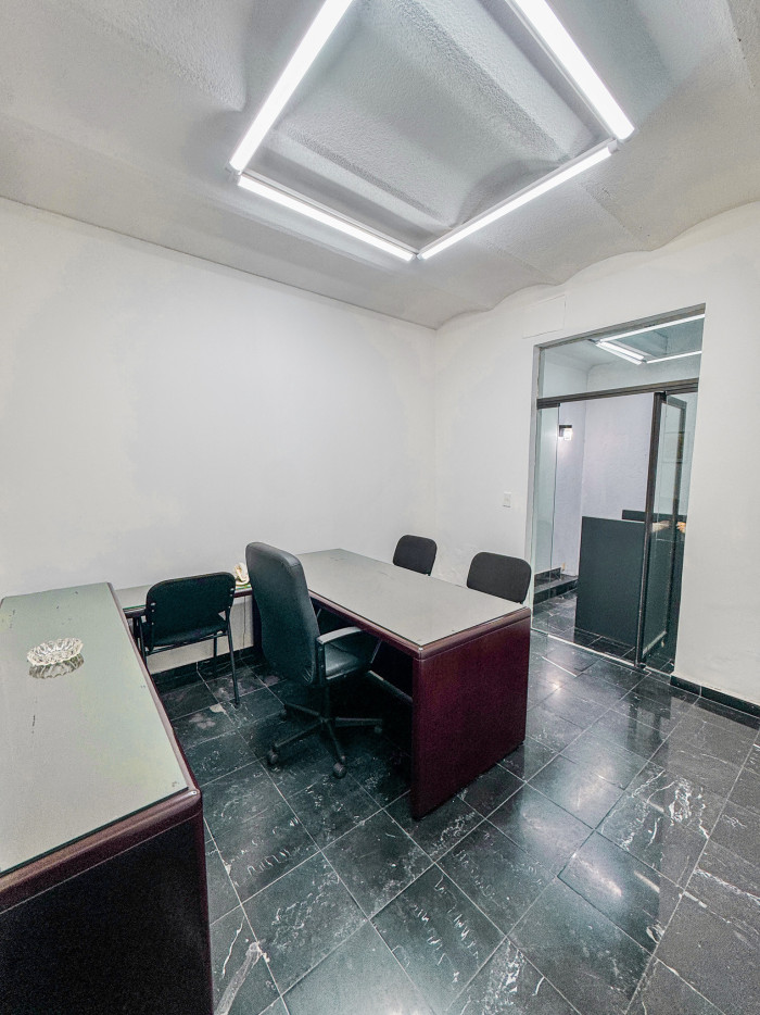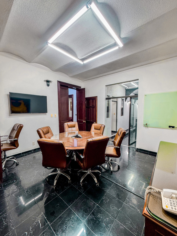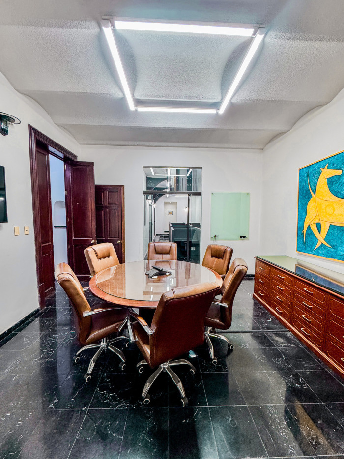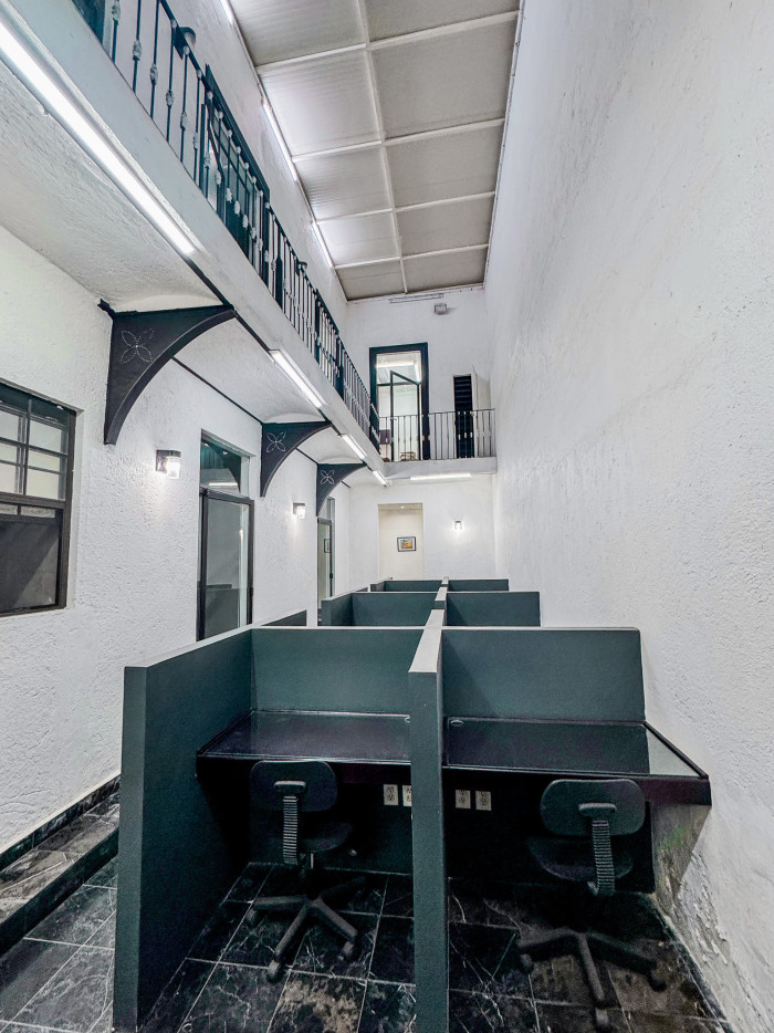 En planta baja dispone de 16 cubículos, 4 oficinas privadas, sala de juntas con capacidad para 8 personas equipada con TV para presentaciones y videoconferencias, pizarrón, dos baños y acceso controlado mediante huella digital.