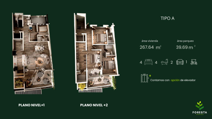 Tipo A con área de vivienda de 267.64 m² y área de parqueo de 39.69 m², precio $575,000 con membresía del club.