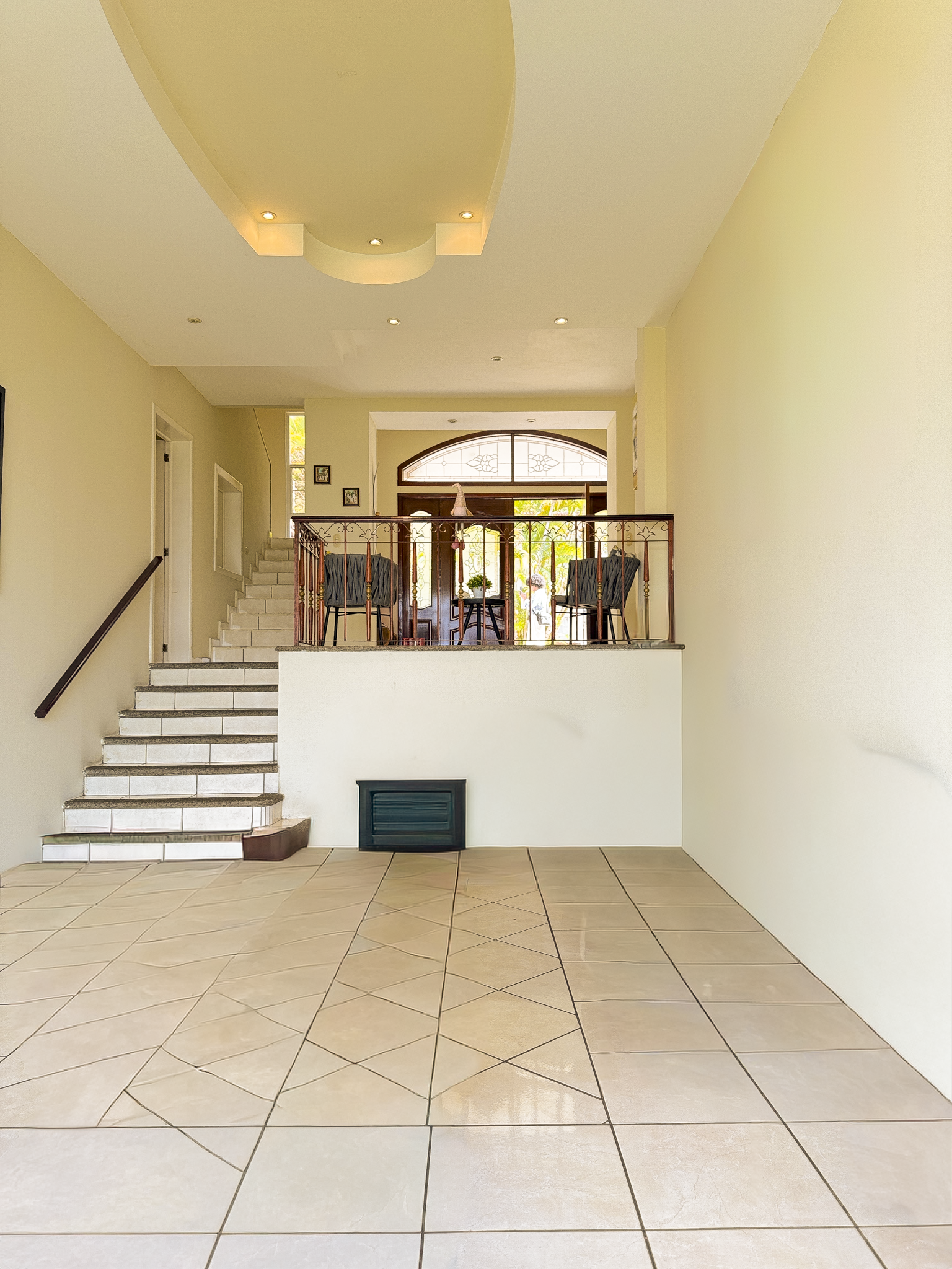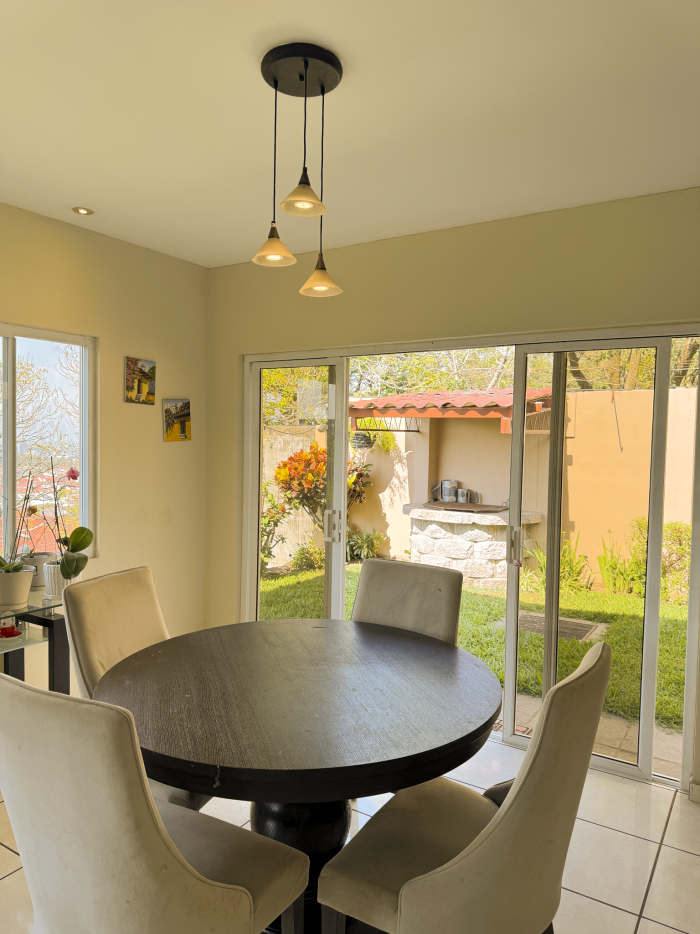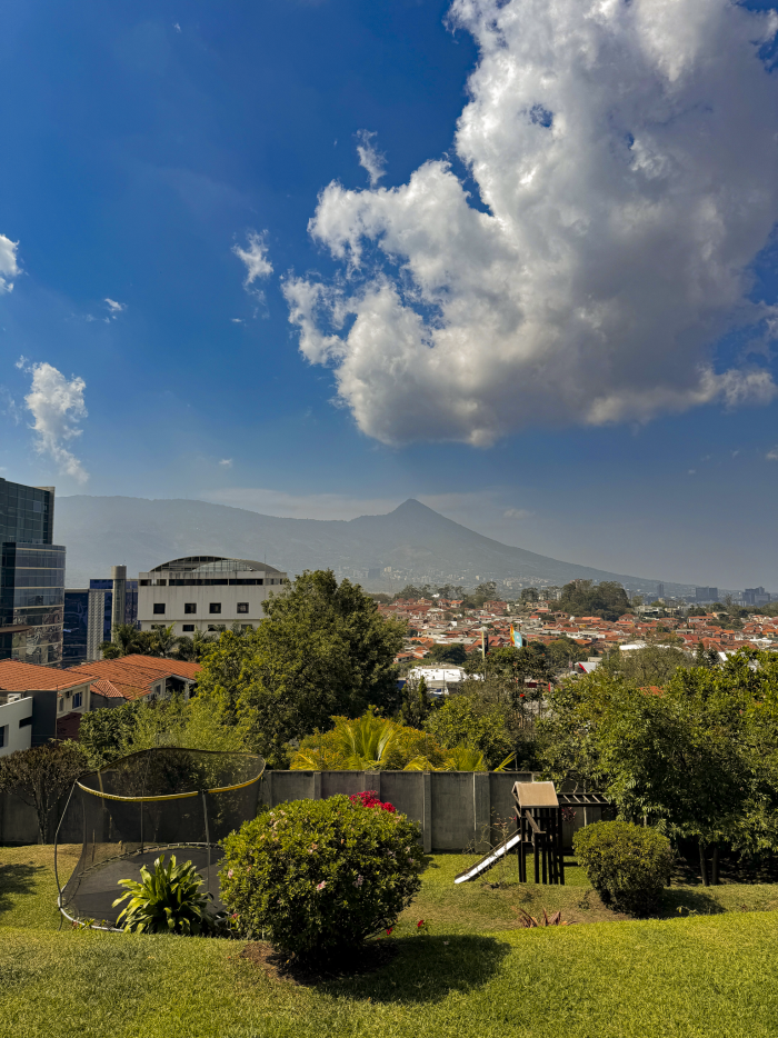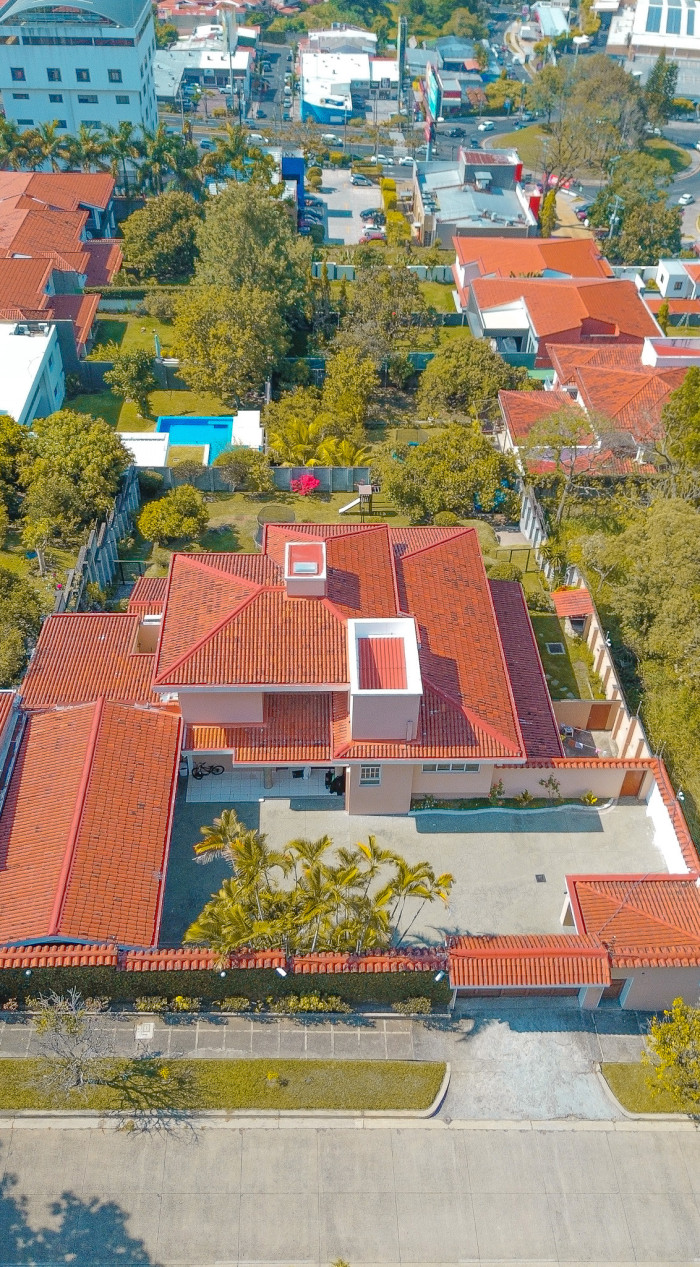 El recorrido a través de sus desniveles conduce a la zona privada, donde se encuentra la habitación máster con sala propia, jacuzzi, walk-in closet y vista al volcán, junto con tres habitaciones adicionales con baño privado y clóset, posee además un estudio independiente, baño social, amplio jardín, área de barbacoa, estacionamiento para 9 vehículos (4 techados) área de lavandería, habitación de servicio y caseta de vigilancia privada. La propiedad cuenta con 523.80 m² de construcción sobre un terreno de 1,825.70 v².