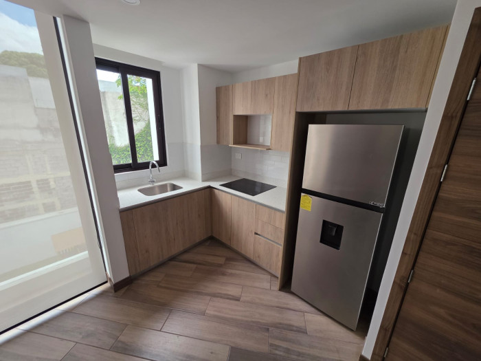 Cuenta con 50.35 m² de construcción, 1 habitación con walk-in closet, 1 baño completo, sala y comedor, balcón, área de lavandería y 1 parqueo. Incluye línea blanca.